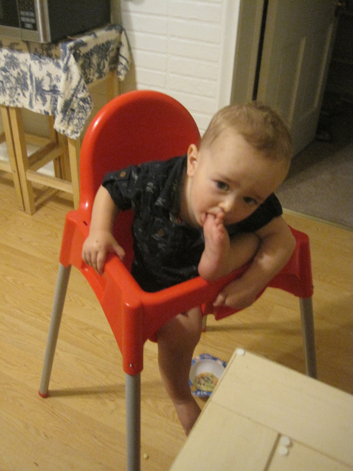You love, love, love to be held, and you walk into the room and point up at me or anyone there and hoot until one of us picks you up. We all get tired of it, though. We're glad you can walk.